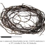 Paciorki, z których rekonstrukcjami miałem do tej pory do czynienia, posiadały otwory o średnicy pozwalającej bez większego problemu nanizać je na lnianą nitkę, a nawet na sznurek konopny, podobnie jak przy tych z Grodźca Małego. Zgoła czegoś zupełnie odmiennego wymagają paciorki o tak małych średnicach, jak te najmniejsze z obiszowskiego zestawu (2 – 2,5 mm). Czegoś zdecydowanie cieńszego, a zarazem na tyle mocnego, żeby nie łatwo było to zerwać. Wydaje się, że eksperyment z warkoczem uplecionym z trzech końskich włosów, w podobny sposób jak wykonano sznureczek z Santoka (Zamelska-Mończak et al. 2025 Ryc. 9), ma szansę podołania takiej potrzebie (patrz zdjęcie powyżej).