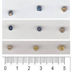 Dzięki niezwykłej uprzejmości Sylwii Siemianowskiej udało się dotrzeć do kilku niezwykle dla nas cennych materiałów w postaci jej pracy magisterskiej poświęconej obiszowskiej osadzie przygrodowej w świetle źródeł ceramicznych (Siemianowska 2011) oraz zdjęć archiwalnych. Do najważniejszych z perspektywy niniejszego artykuły z pewnością należą zdjęcia poszukiwanych paciorków oznaczonych nr inw. Obi160/86 i Obi161/86, czyli 3 żółtych i 3 walcowatych ze skorodowanego szkła. Na zdjęciach nie tylko zobaczymy, że żółte paciorki można nazwać co najwyżej zniekształconymi oraz że oprócz korozji na tych walcowatych wyraźnie widoczne jest niebieskie szkło.